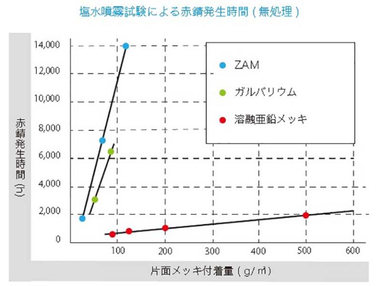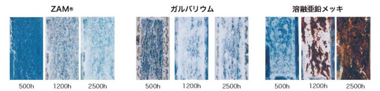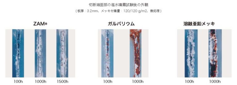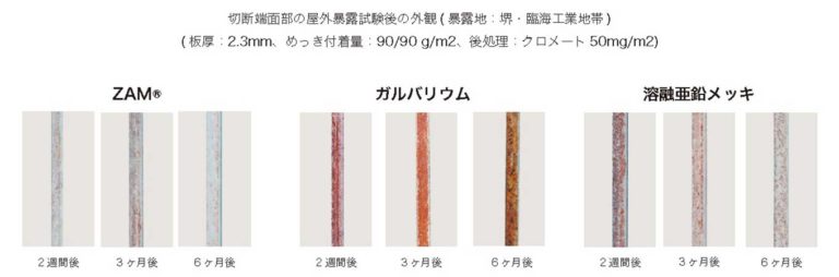 ZAMは溶融亜鉛メッキ、ガルバリウムに比べ 優れた耐赤錆性を有しています。