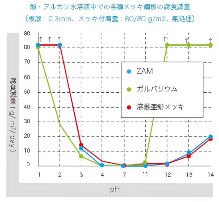ZAMは酸・アルカリ水溶液中では溶融亜鉛メッキと 同様の腐食挙動を示します。
