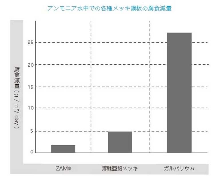 ZAMの耐アンモニア性は、溶融亜鉛メッキや、 ガルバリウムに比べて優れています。
